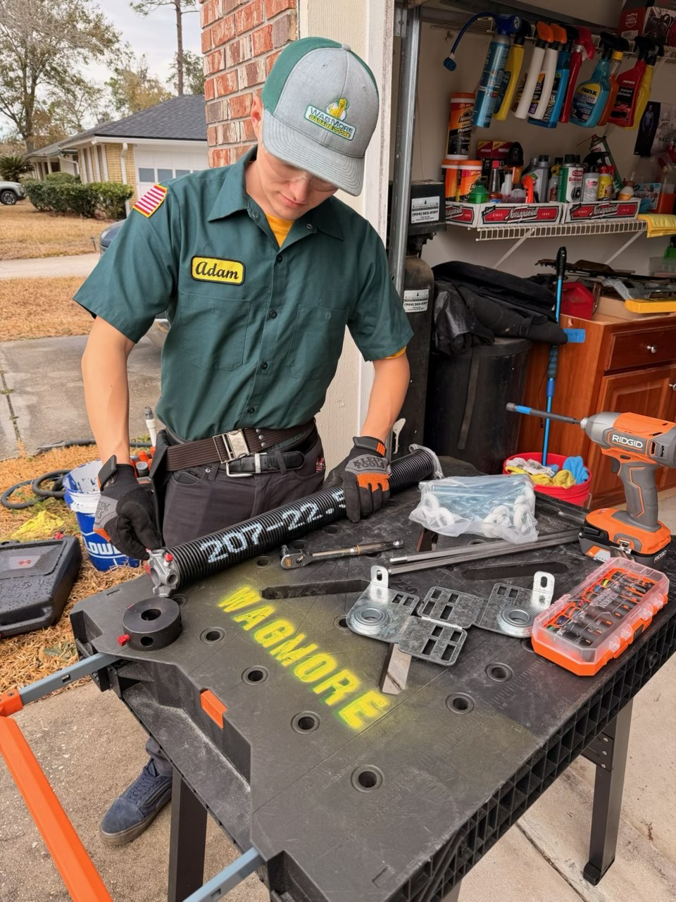 Our $0 Safe & Sound Inspection on two Wayne Dalton doors in Fruit Cove uncovered heavy spring balance, noisy hinges, and metal shavings from years of skipped lubrication—all before the customer ever noticed a problem. A full maintenance service restored smooth, quiet operation on both doors.